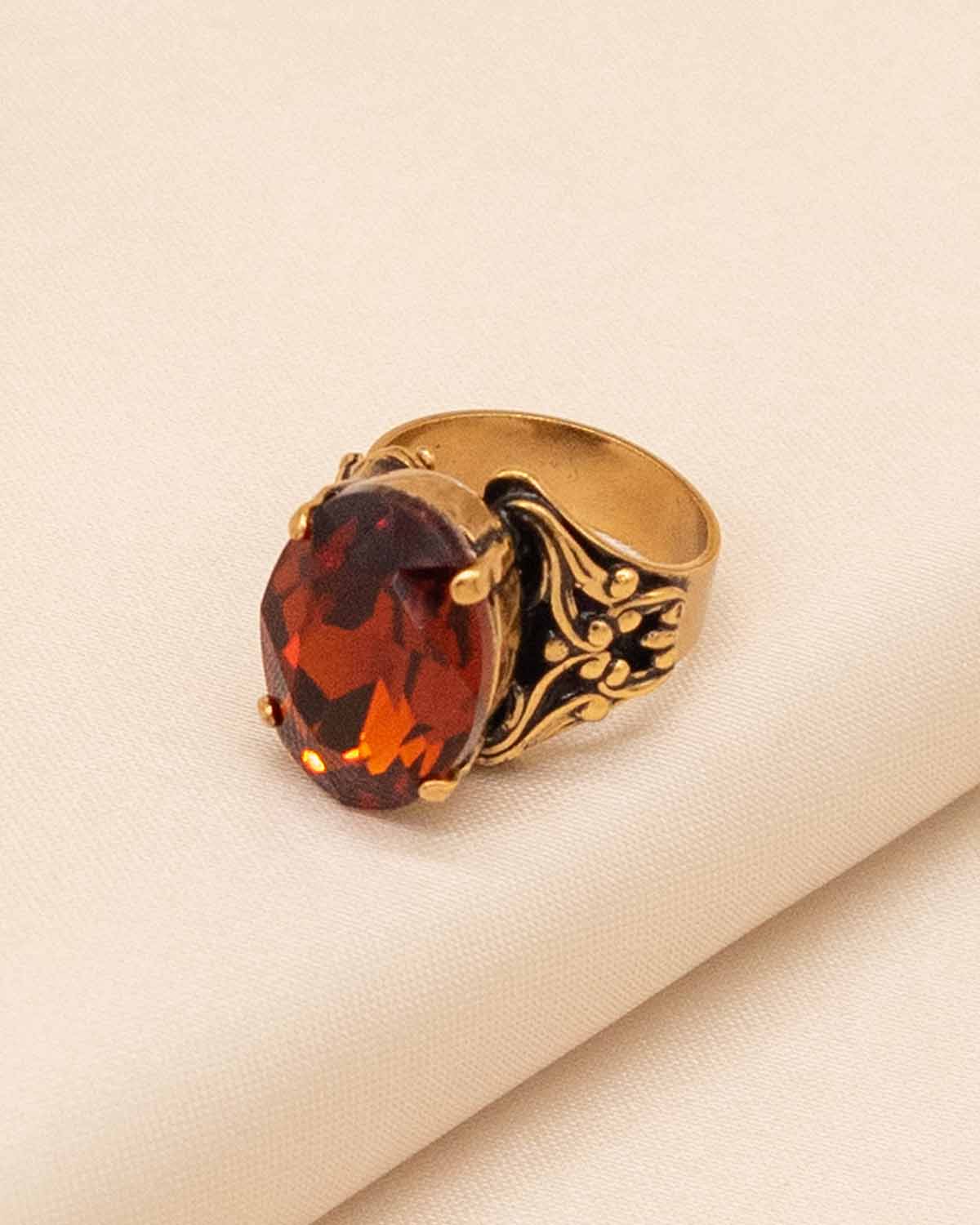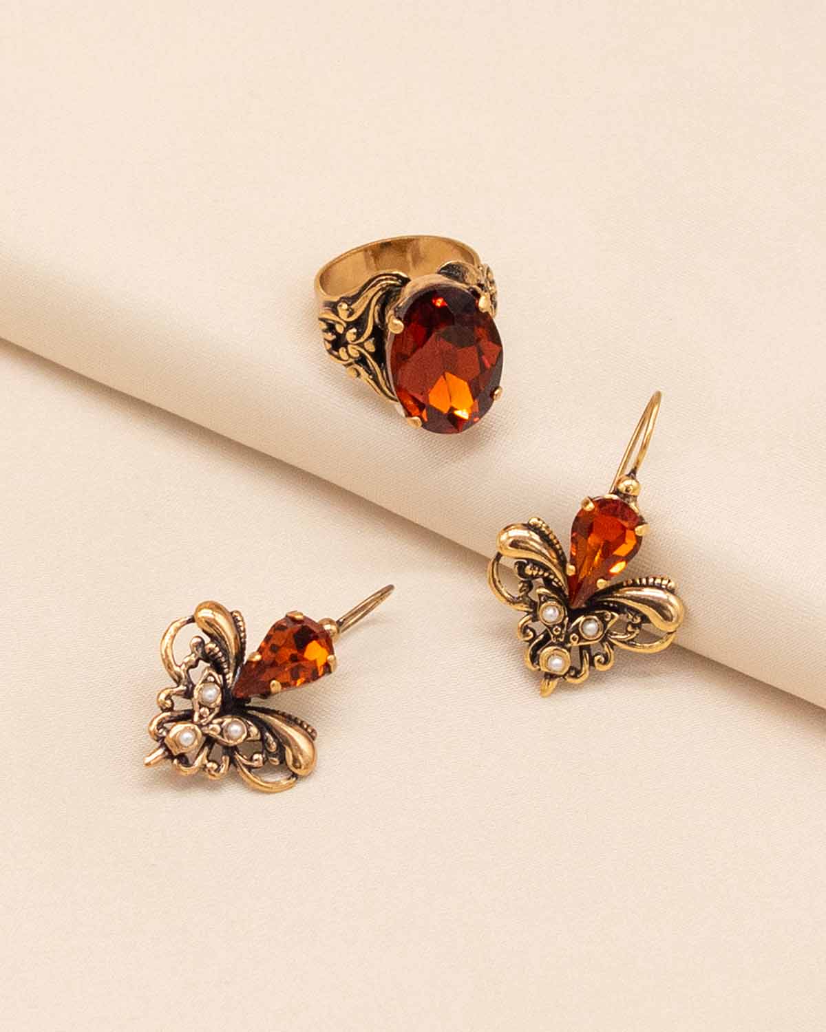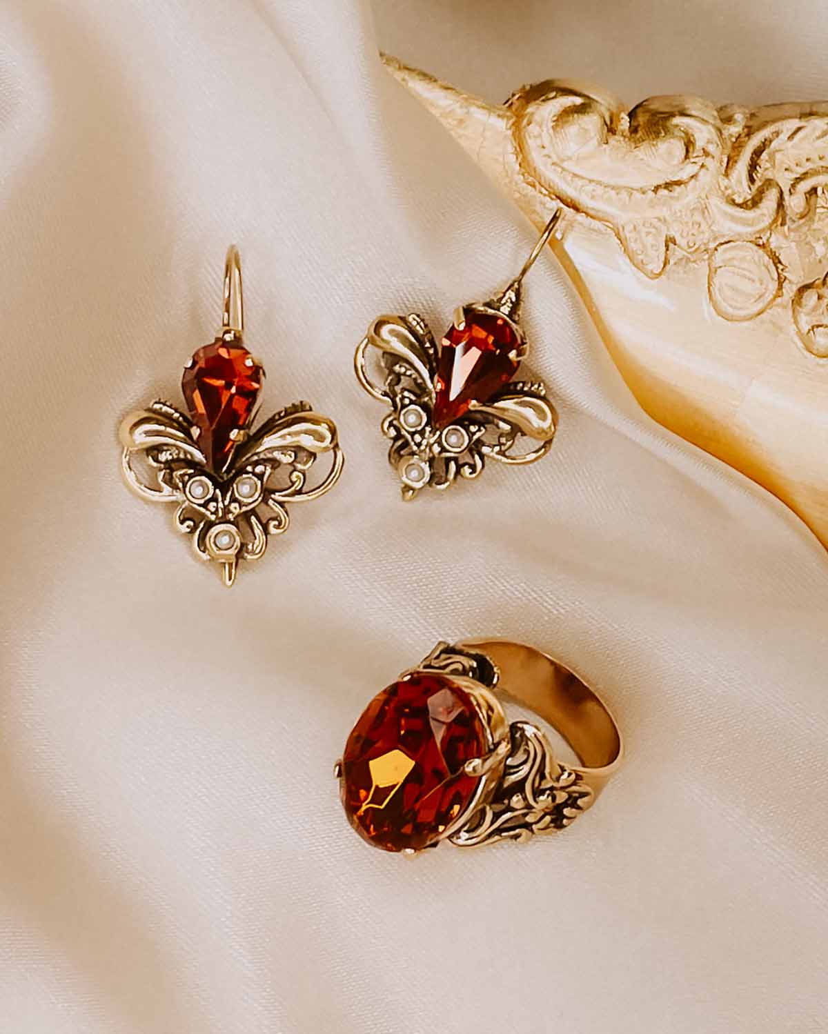 • This artisanal floral earring and ring set is decorated with faceted crystals in a vintage Tuscan style