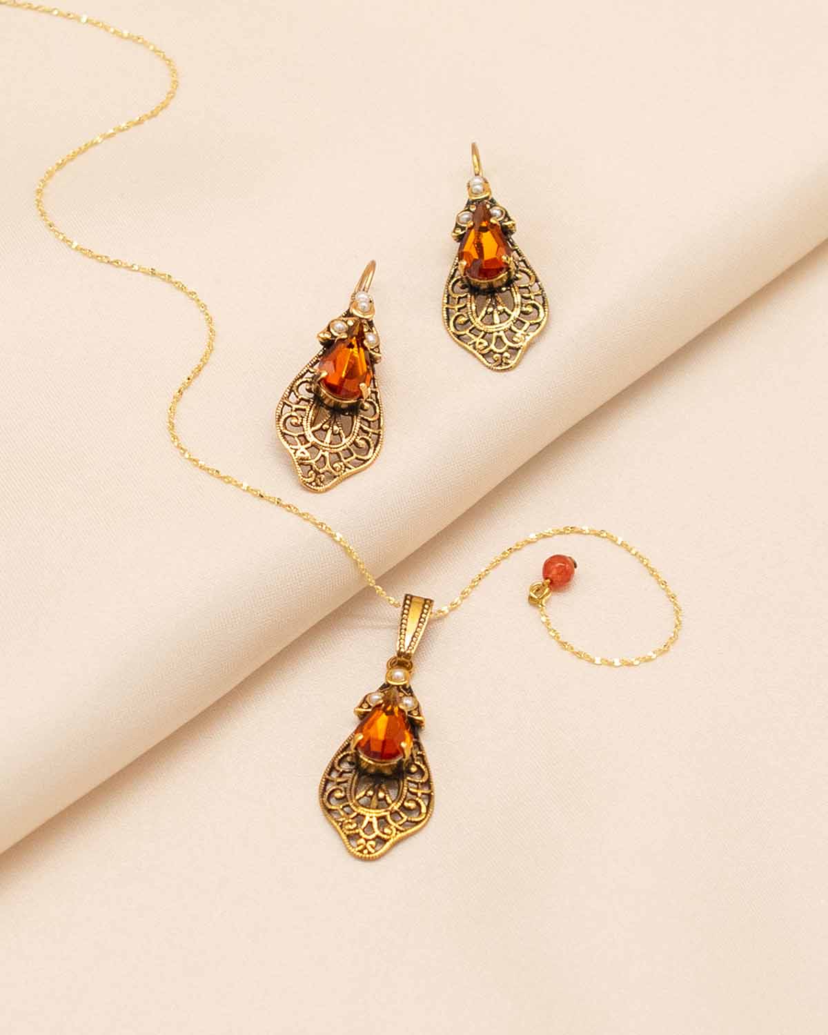 - This artisanal lace earring and necklace set is decorated with faceted crystals and synthetic pearls in a vintage Tuscan style