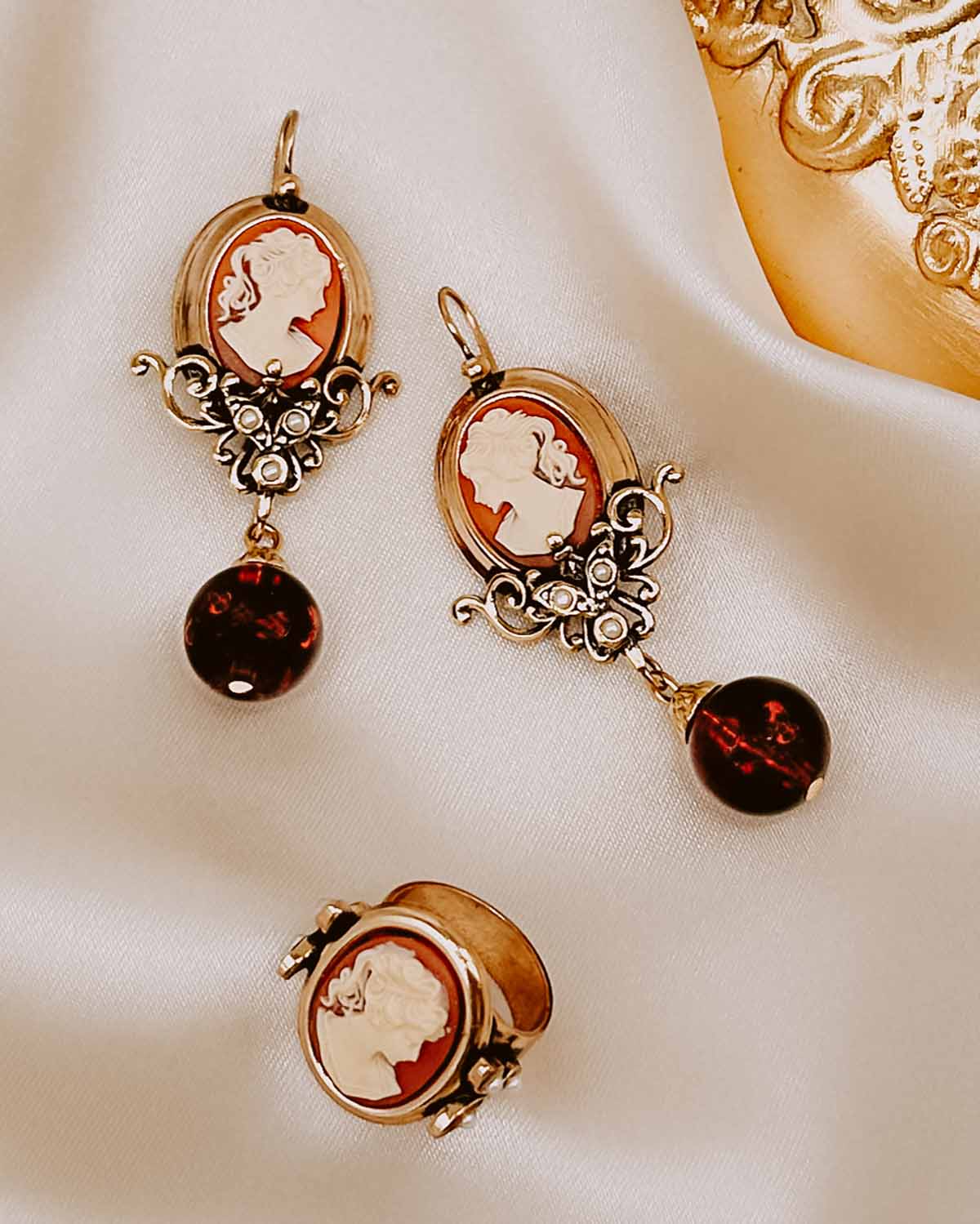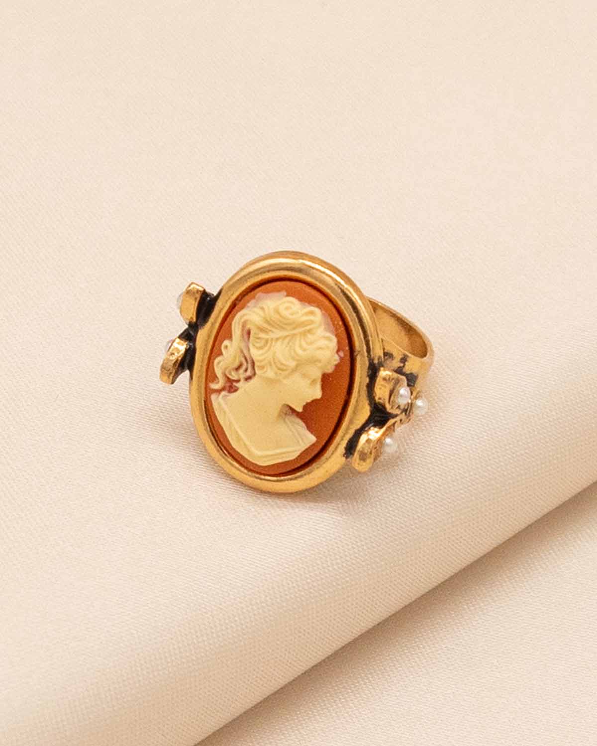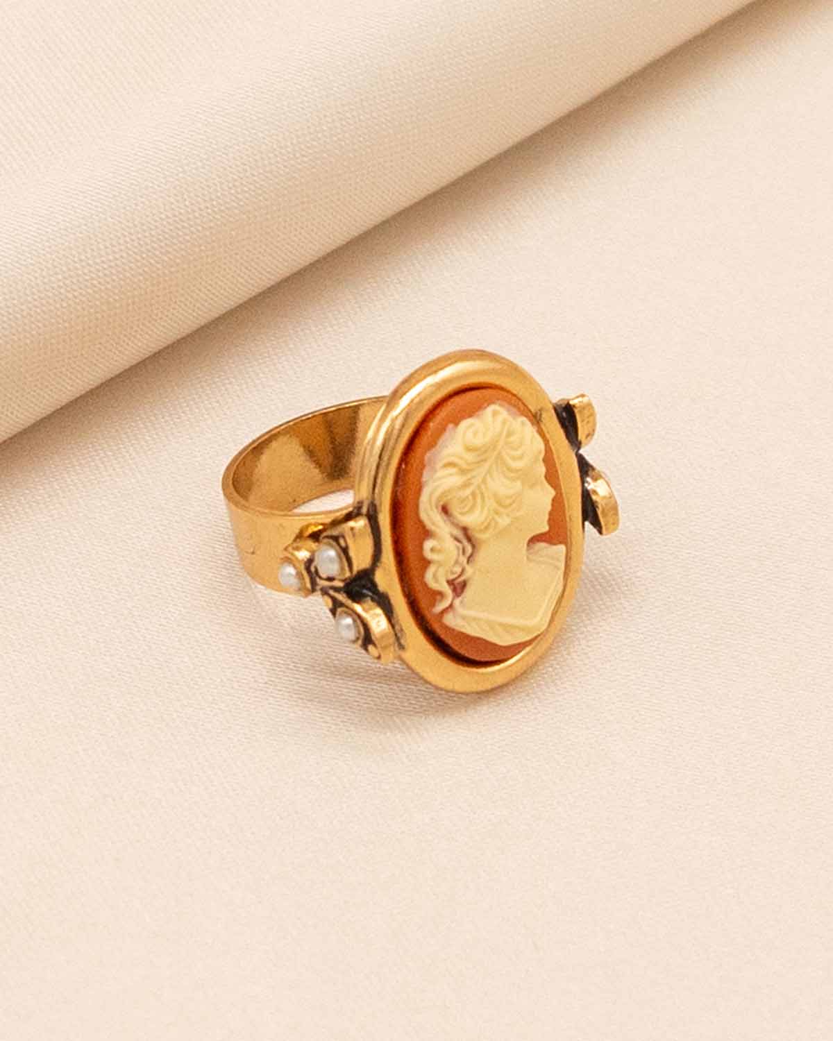 - This artisanal large oval ring is decorated with synthetic cameo and pearls in a vintage Tuscan style