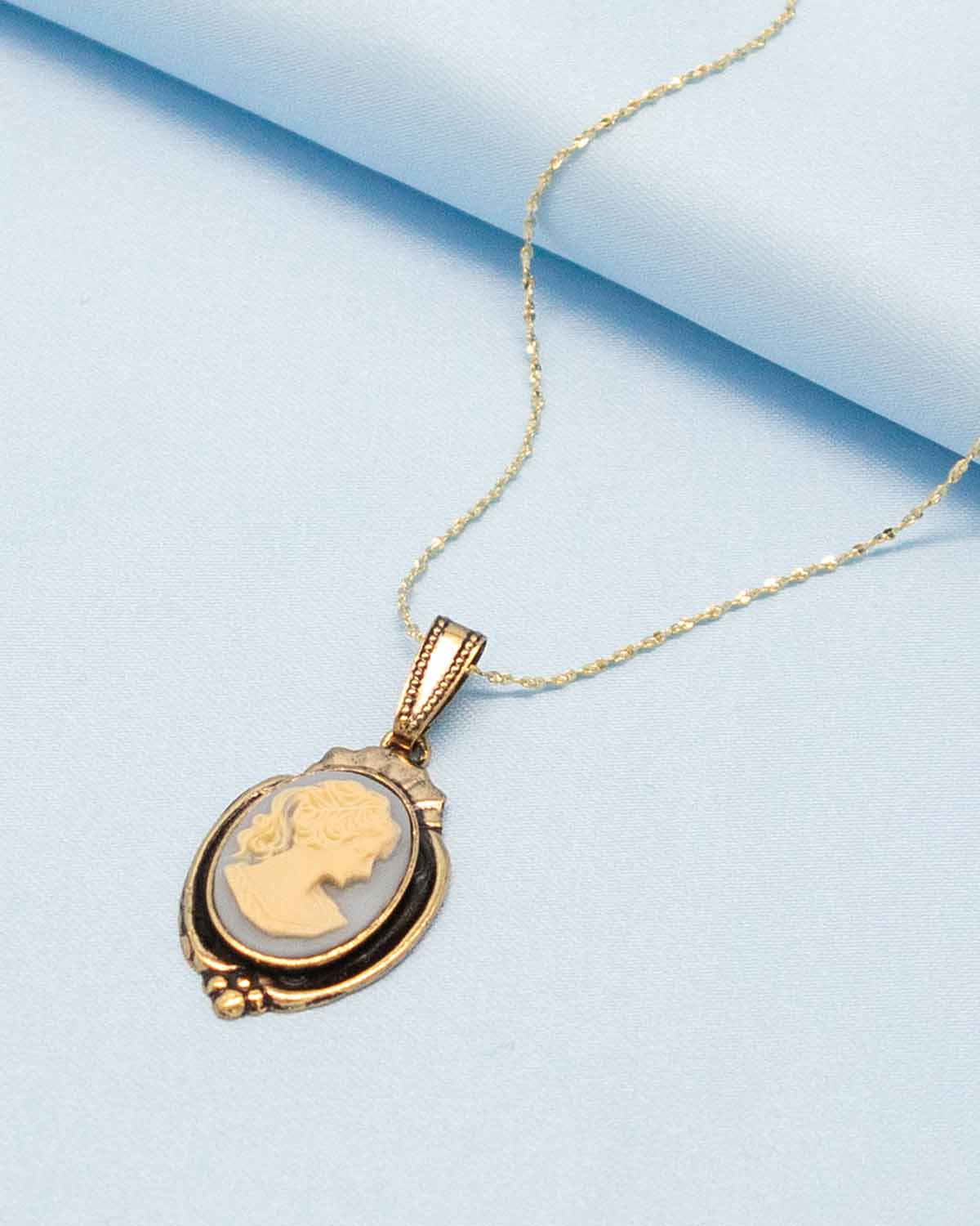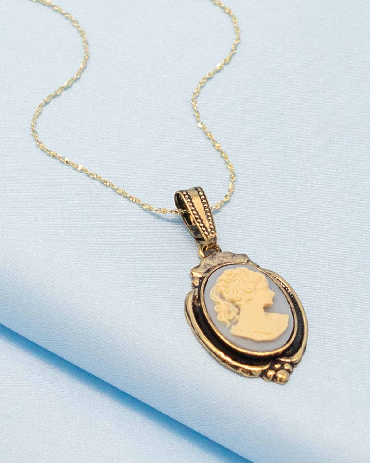 - This artisanal oval pendant necklace is decorated with a synthetic cameo in a vintage Tuscan style