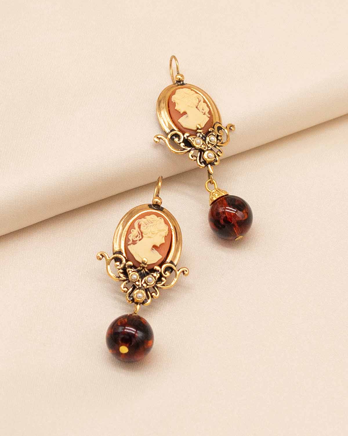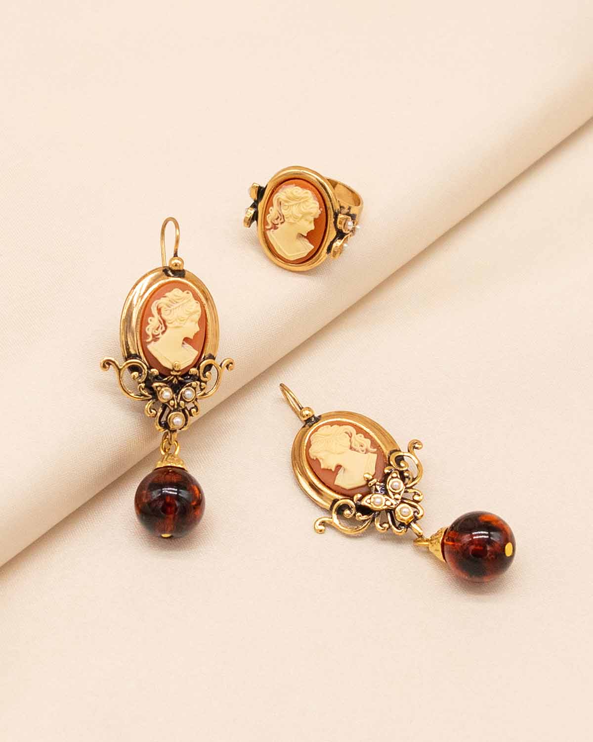 • Questo set artigianale di orecchini e anello è decorato con cammei e micro perle sintetiche, e imitazione ambra in stile vintage toscano.