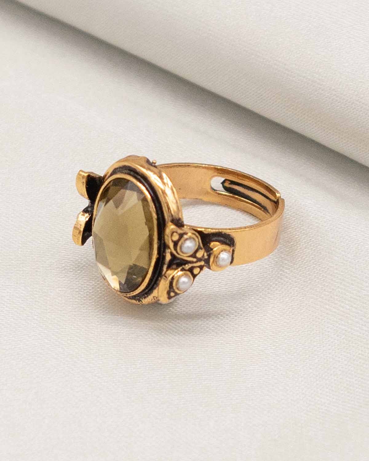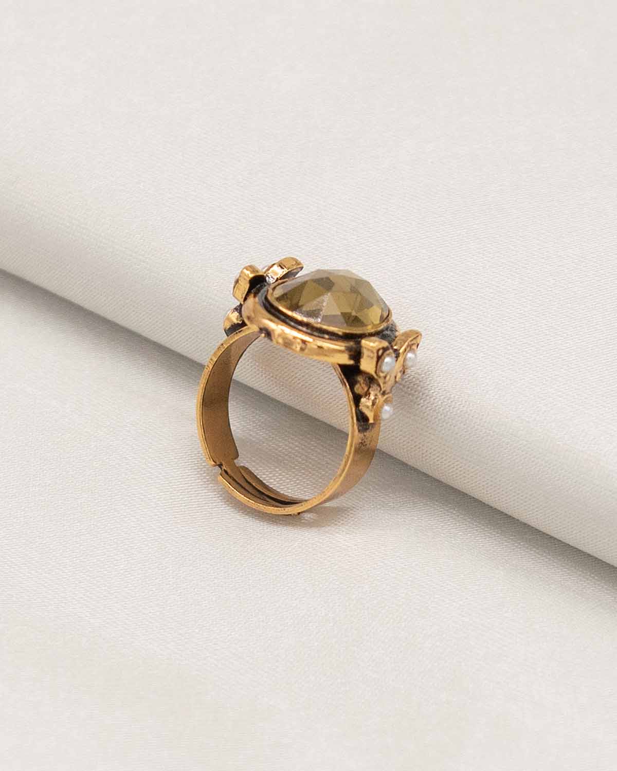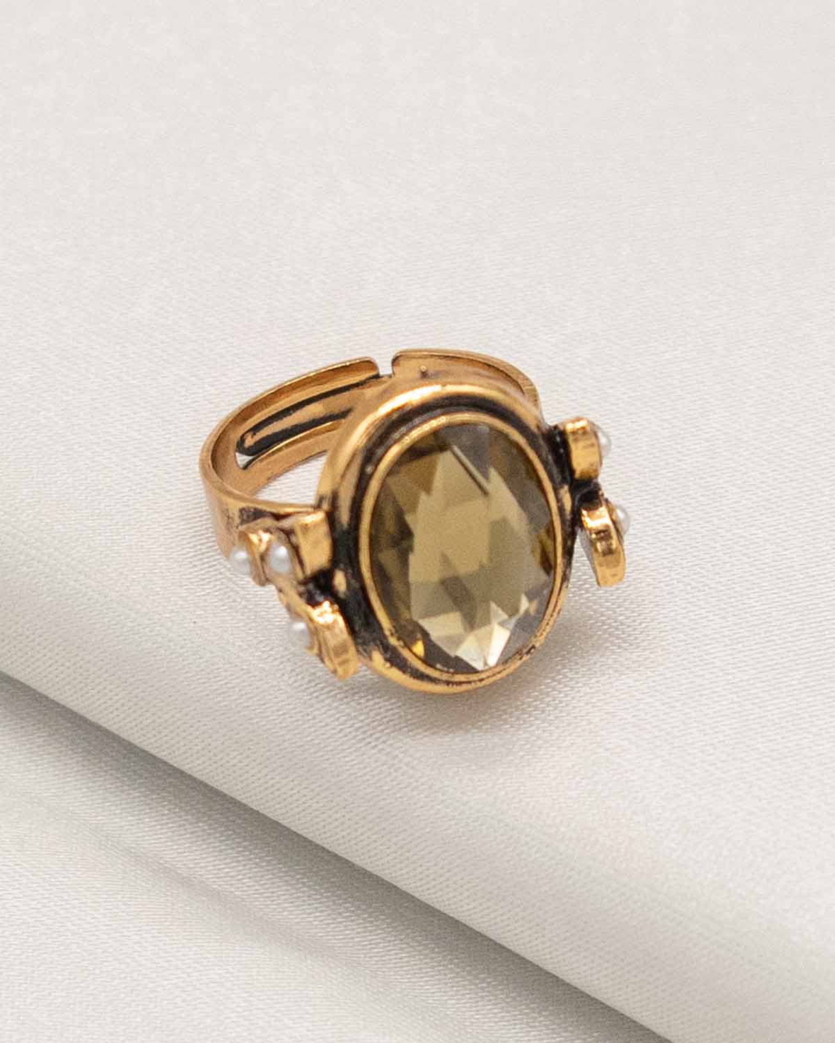 - Questo anello artigianale ovale è decorato con un cristallo sfaccettato e perle sintetiche in stile vintage toscano