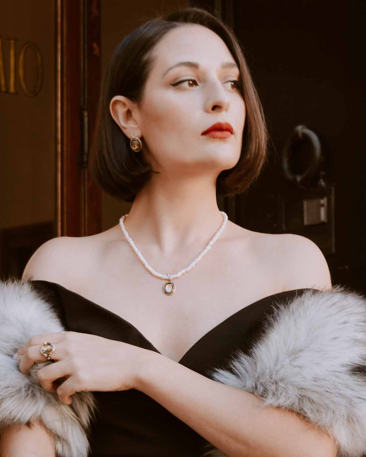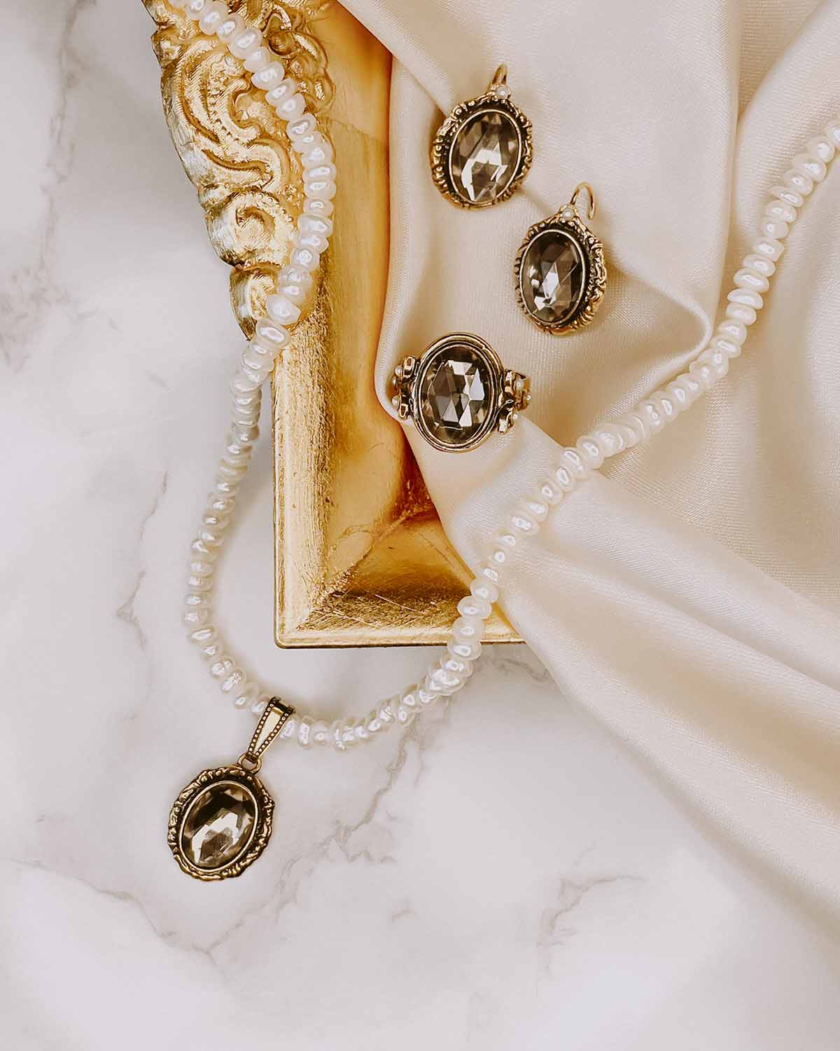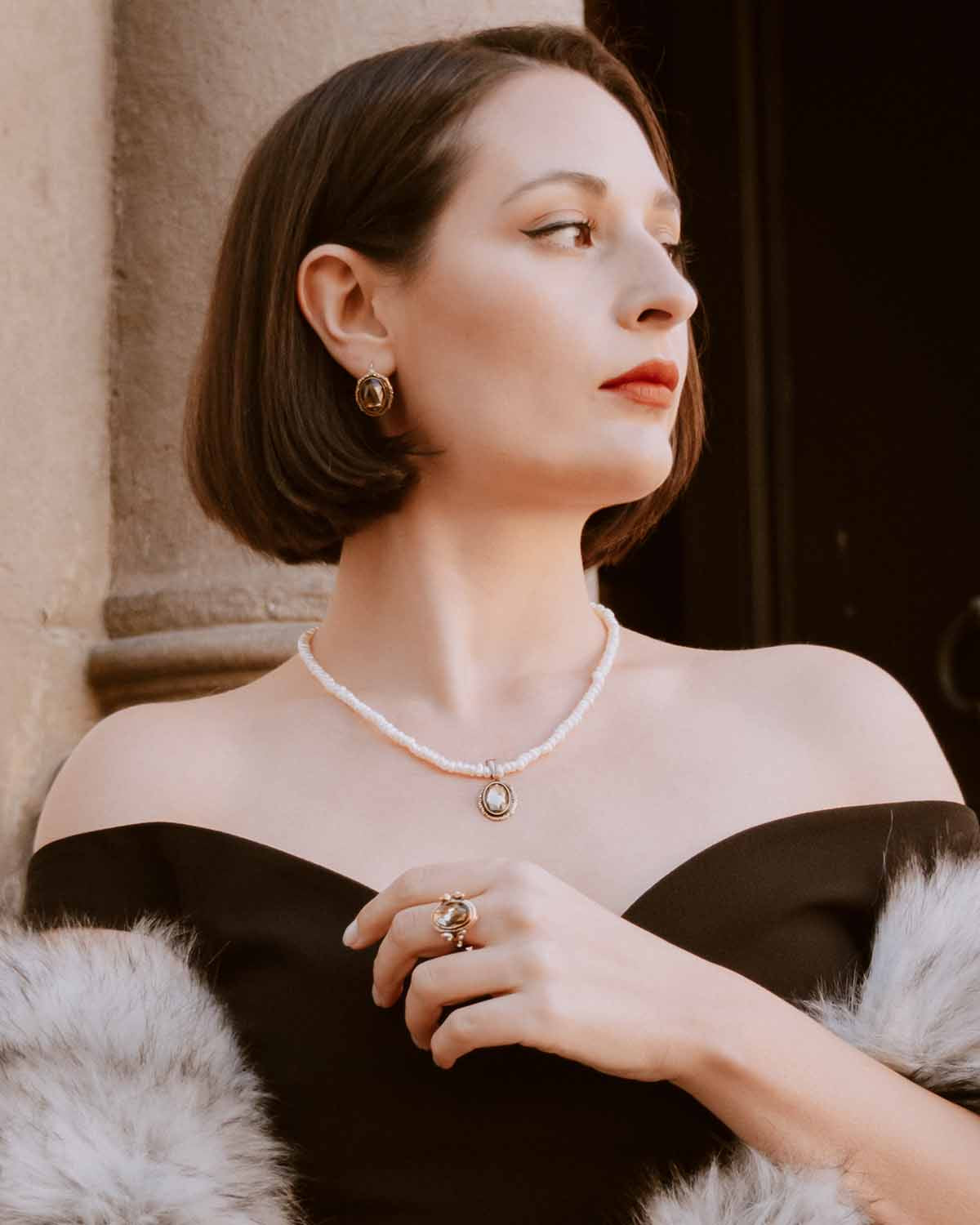 La nostra collezione in edizione limitata House of Ortica celebra il glamour e l'eccentricità dell'eleganza italiana. Cristalli sfaccettati fumé e labradorite luccicante, ornati da incantevoli perle barocche per il perfetto tocco di opulenza.