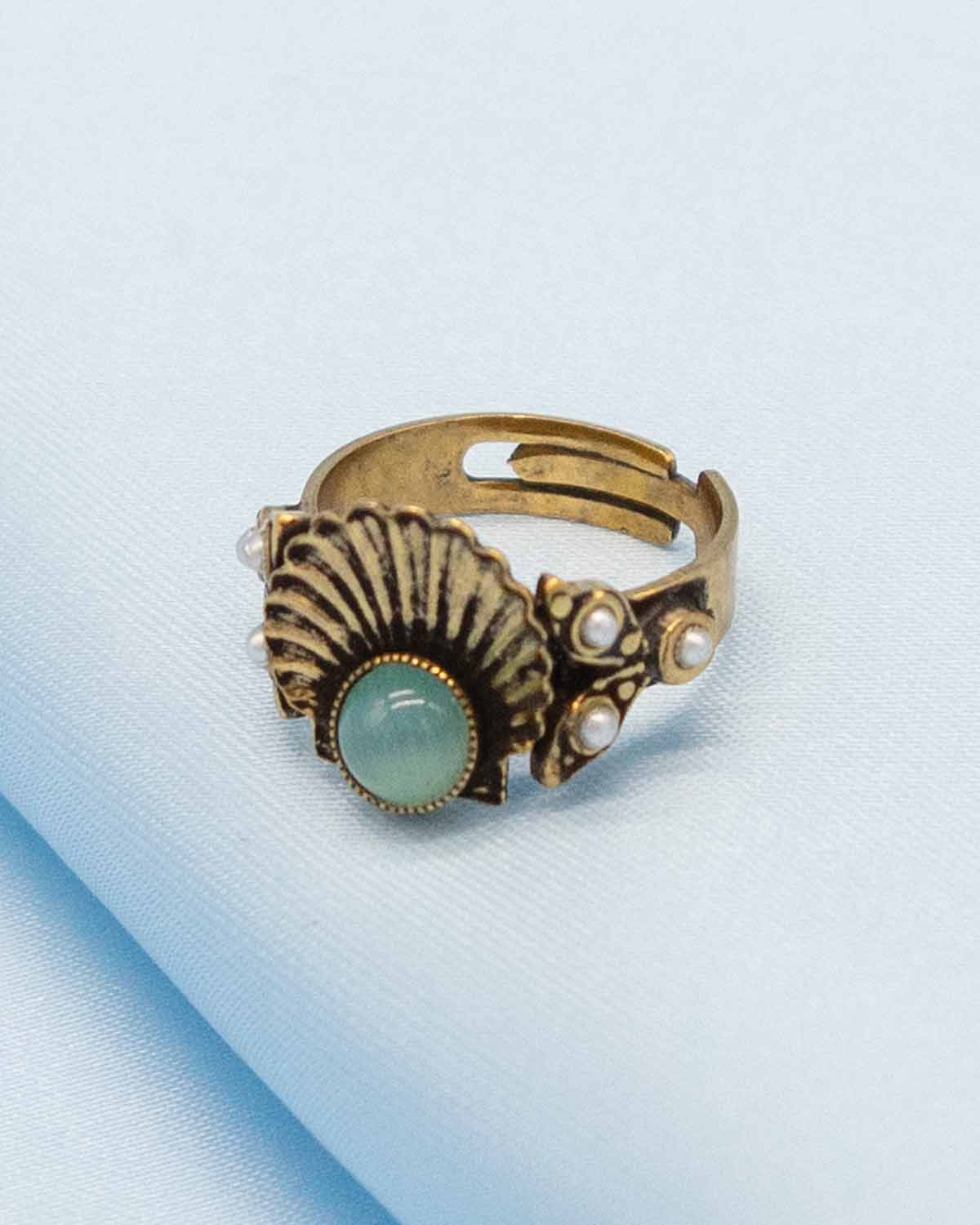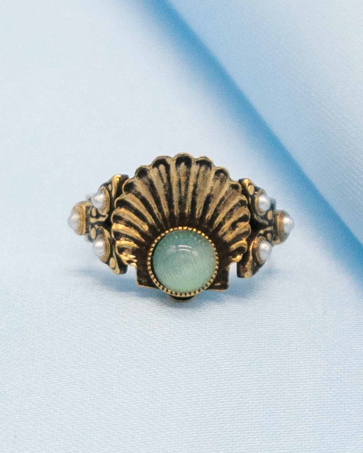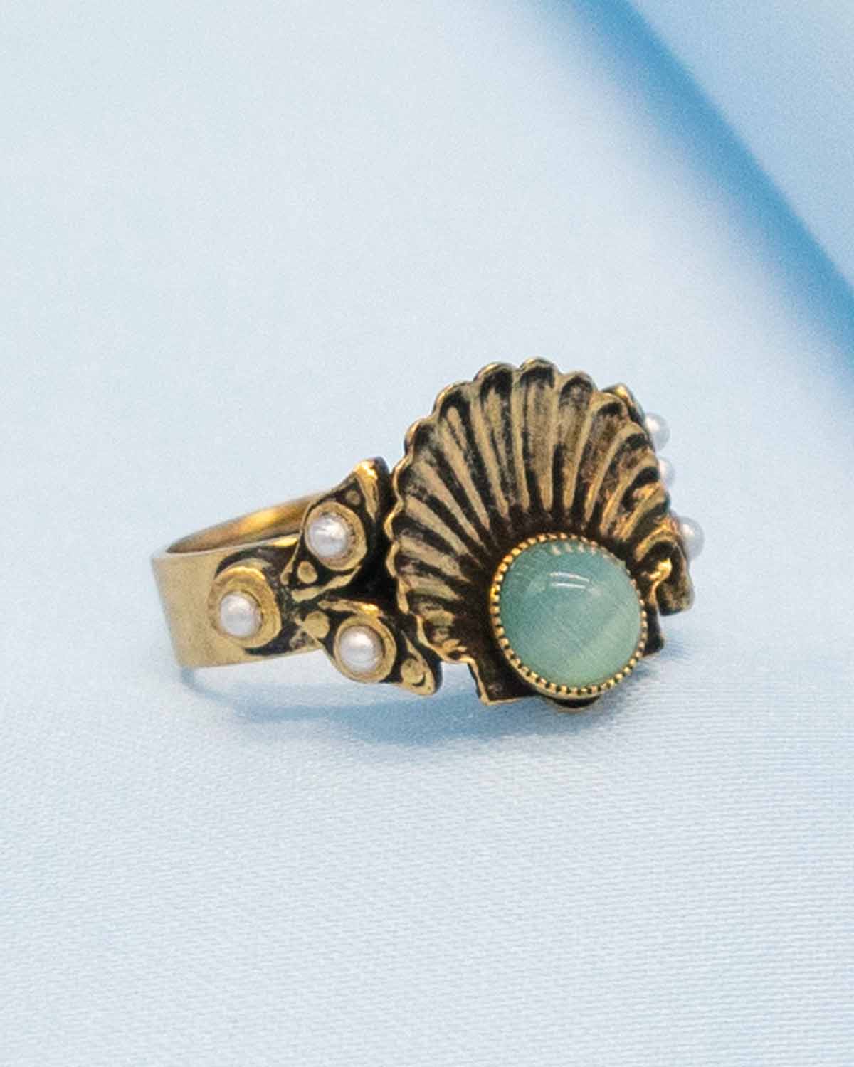 - Questo anello artigianale a forma di conchiglia è decorato con cabochon in vetro a lavorazione veneziana e perle sintetiche in stile vintage toscano