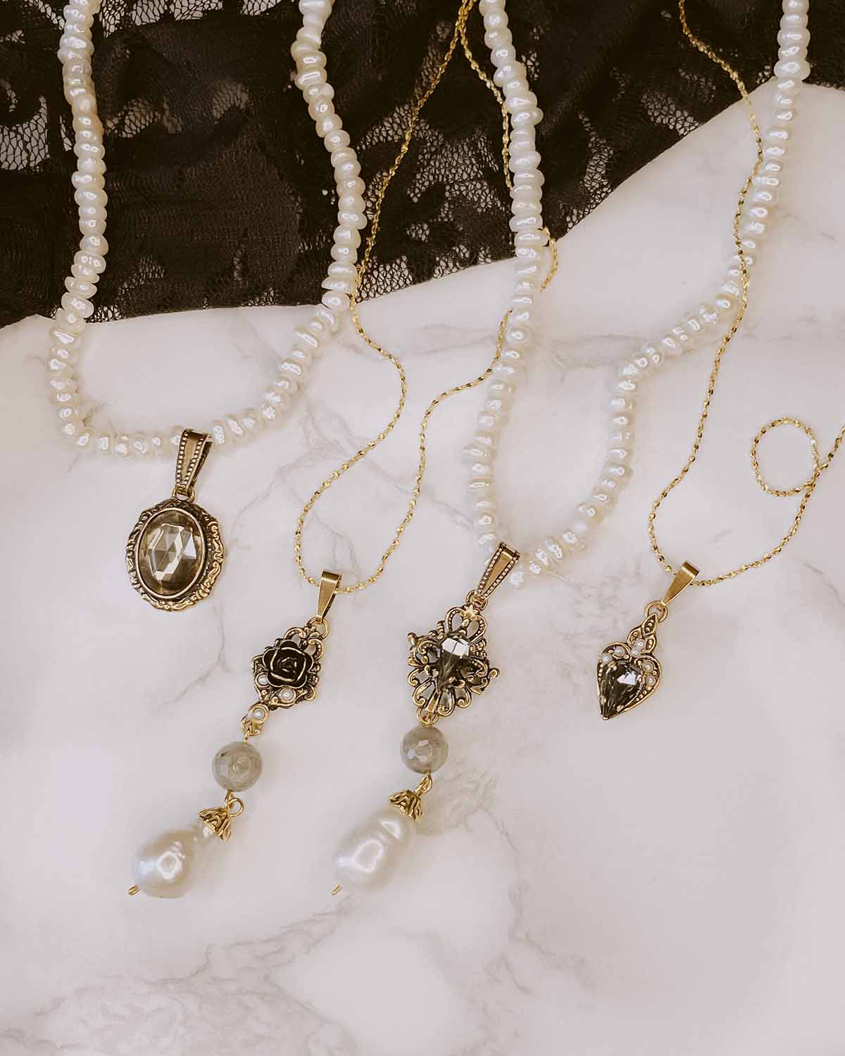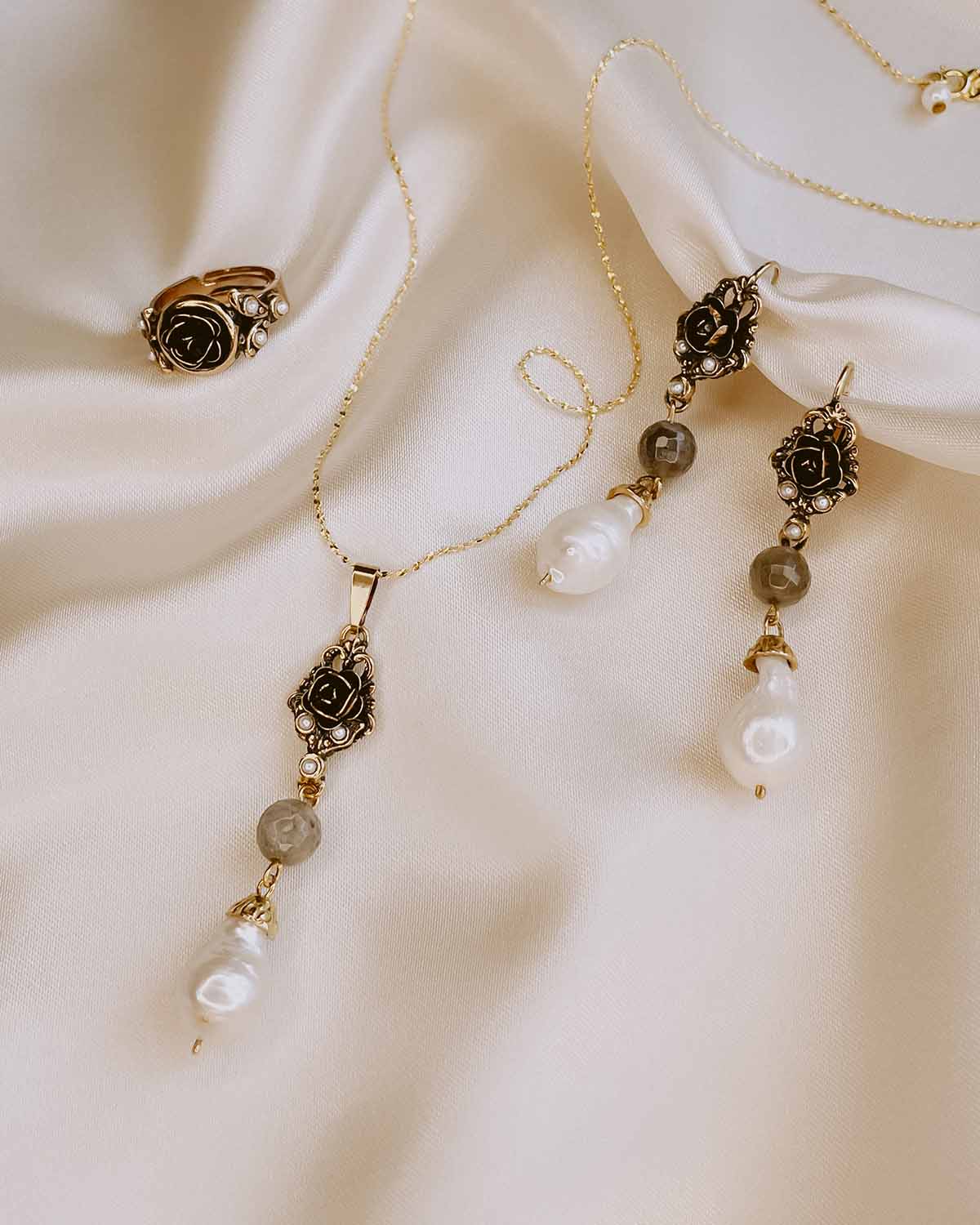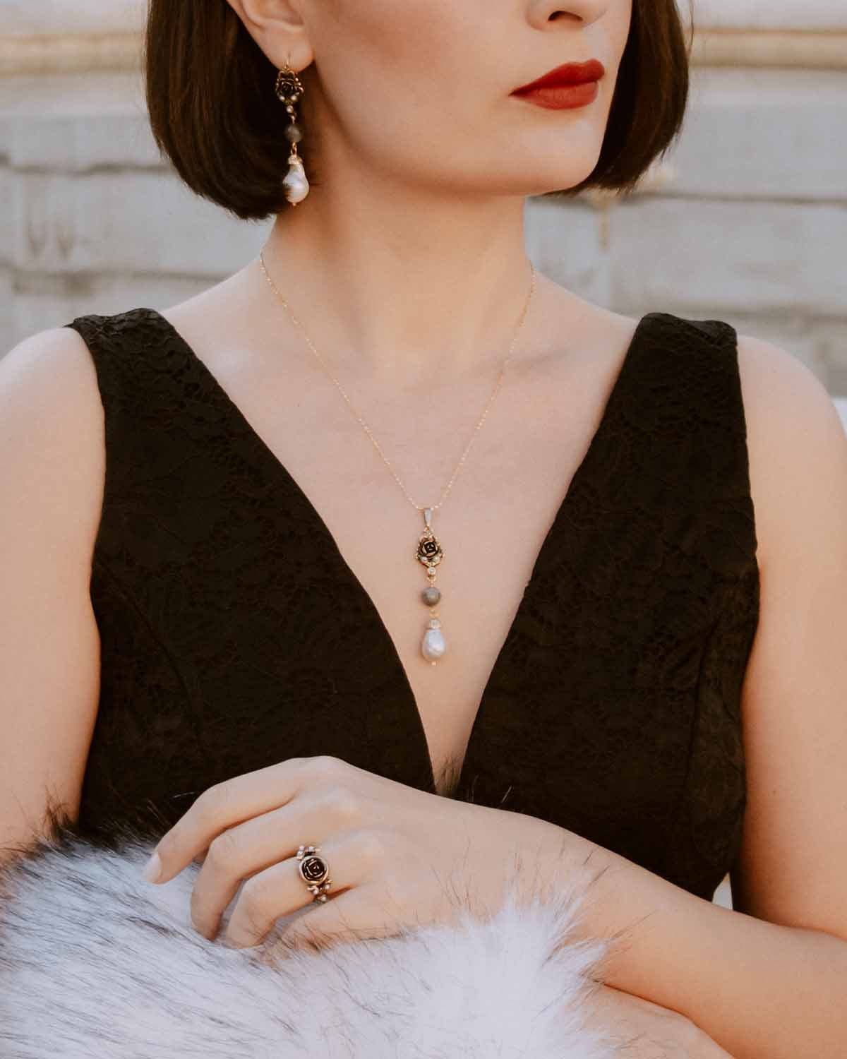 La nostra collezione in edizione limitata House of Ortica celebra il glamour e l'eccentricità dell'eleganza italiana. Cristalli sfaccettati fumé e labradorite luccicante, ornati da incantevoli perle barocche per il perfetto tocco di opulenza.