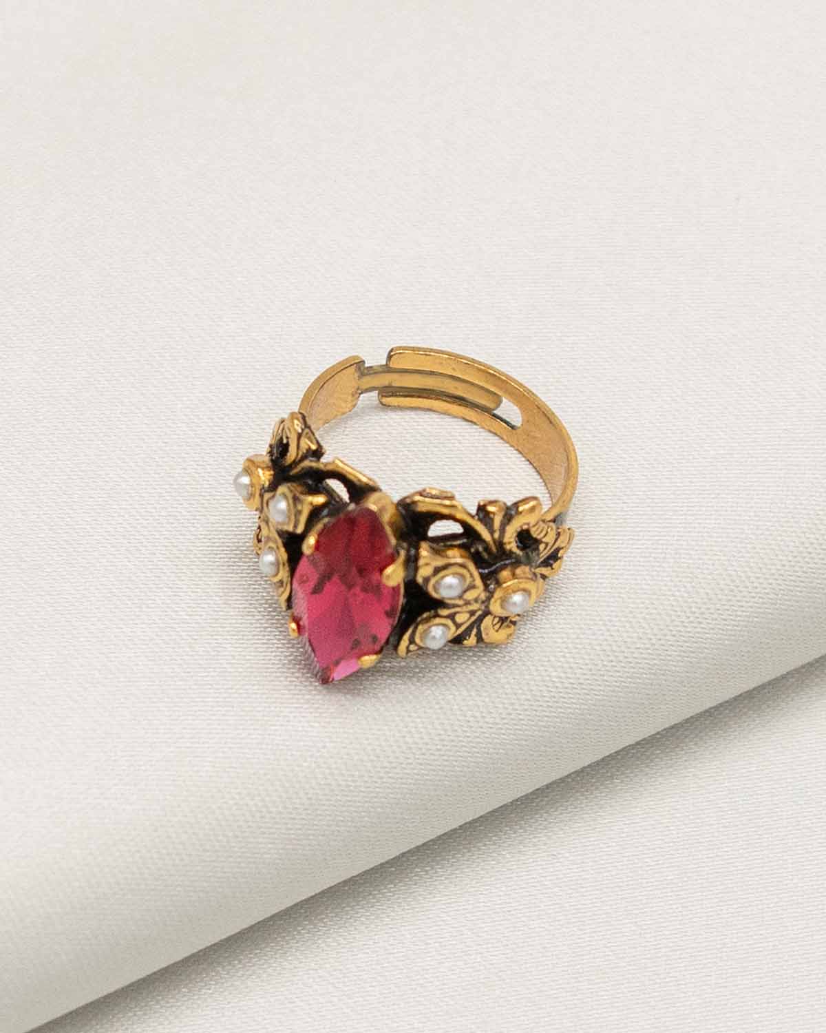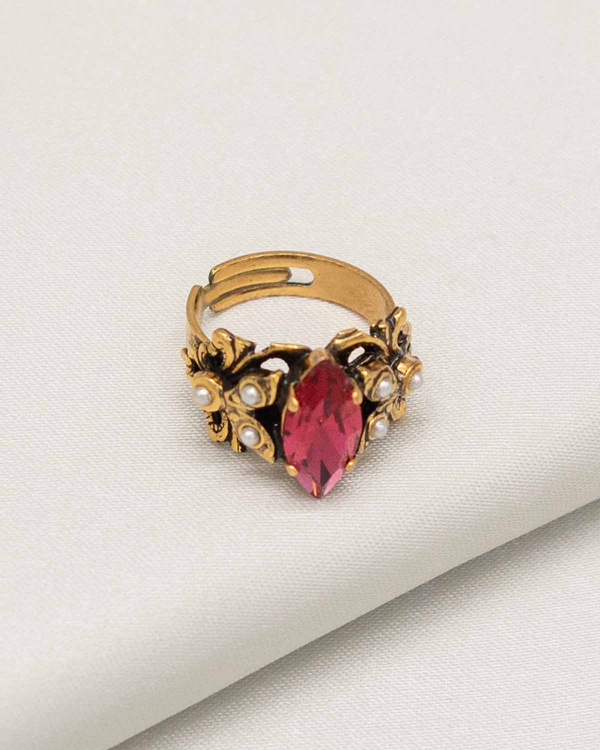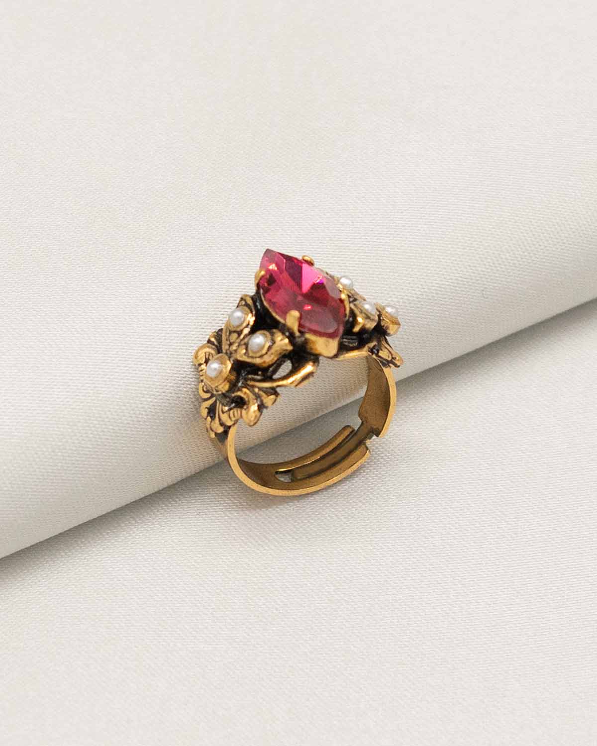 - This artisanal floral ring is decorated with a faceted crystal and synthetic pearls in a vintage Tuscan style